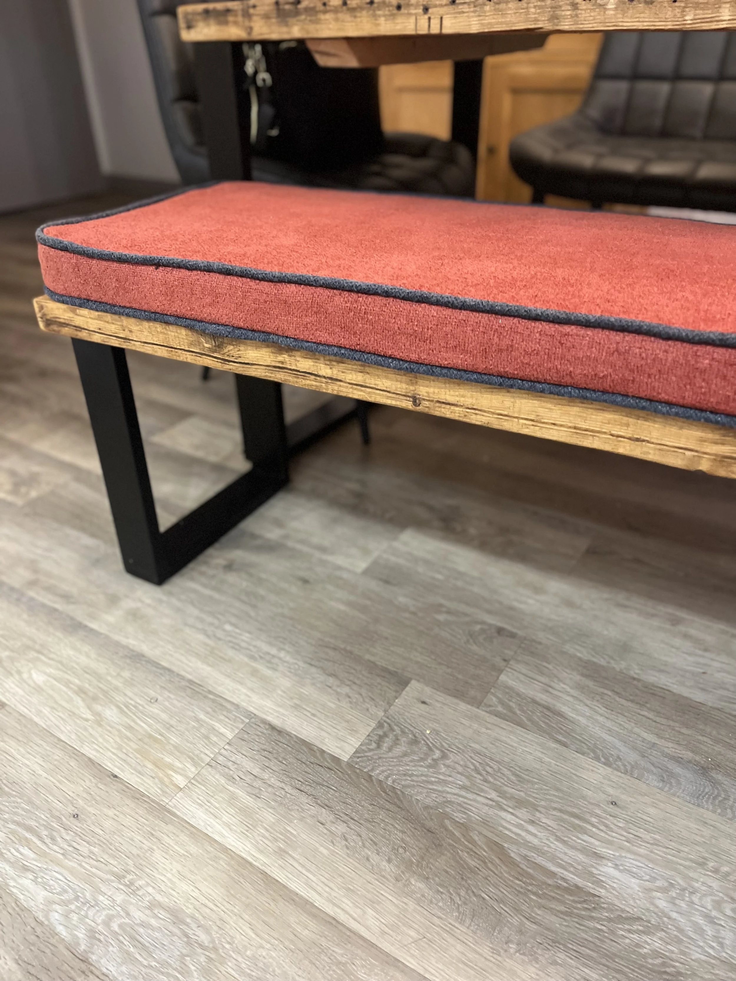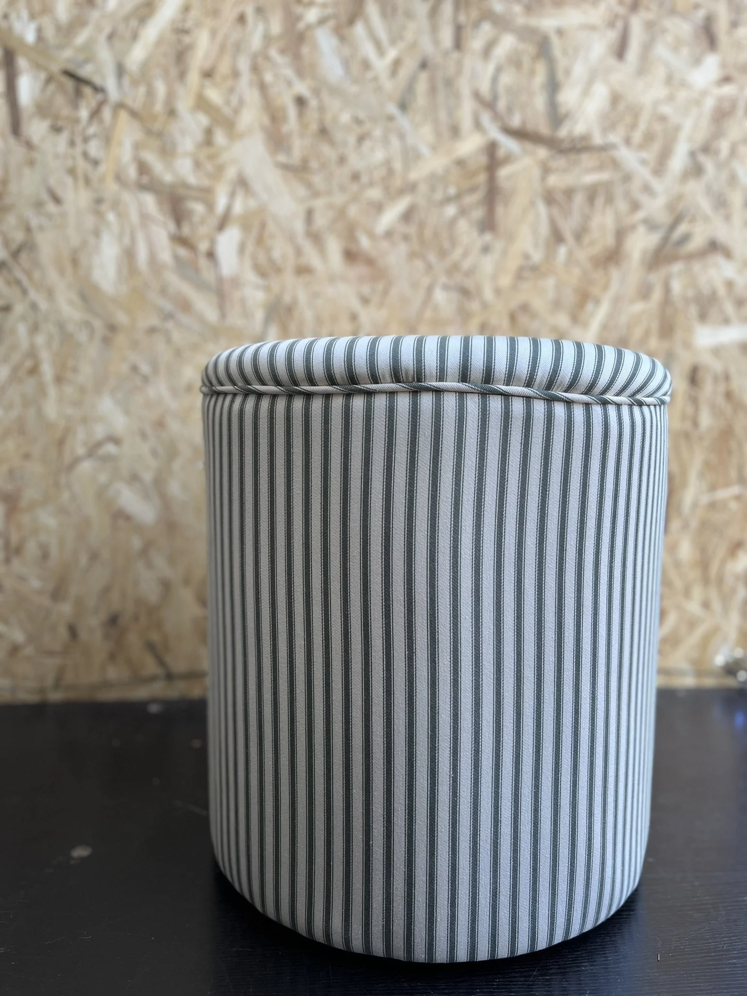 A pouffe stool, shown here in cotton and linen blend green ticking fabric is perfect for your dressing table, bedroom, or extra seating for your lounge. Handcrafted with a timber frame, this stool can be made to order in a fabric of your choice.